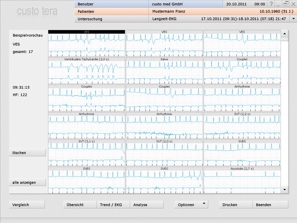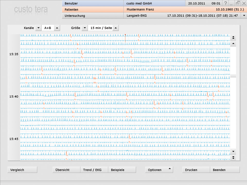 EKG örneğinin durumu - aslında uzun epizot (örn. taşikardi) değerlendirilmesi ile - herhangi bir zamanda görüntülenebilir. Rapor için isteğe bağlı olarak EKG bölümleri yazdırma hızı ve çözünürlüğüyle birlikte seçilip işaretlenebilir.