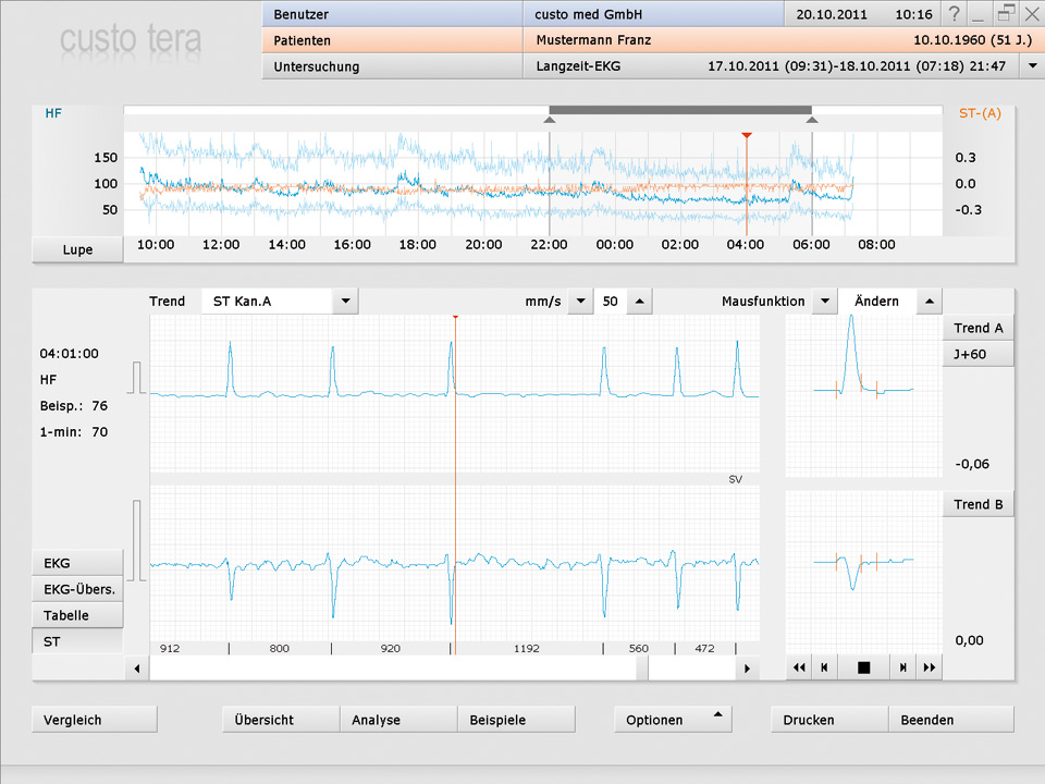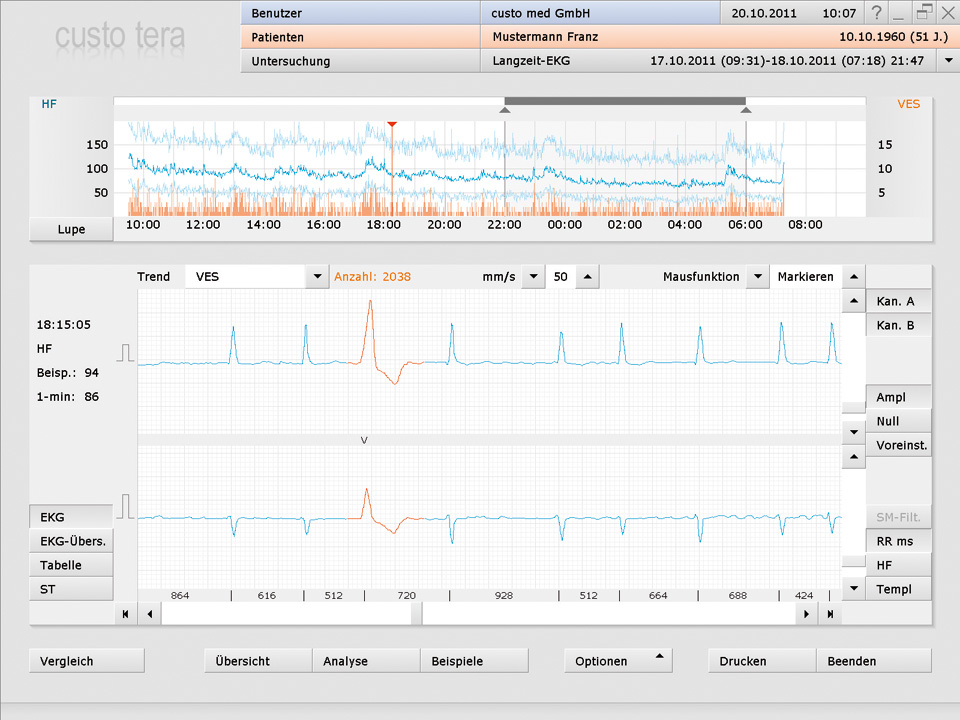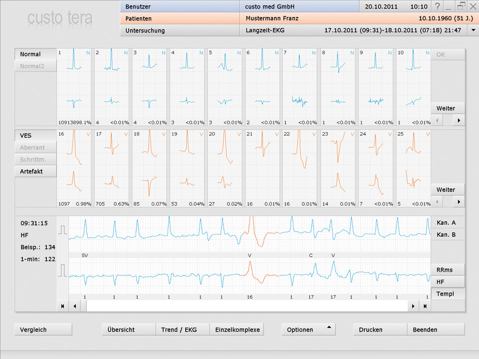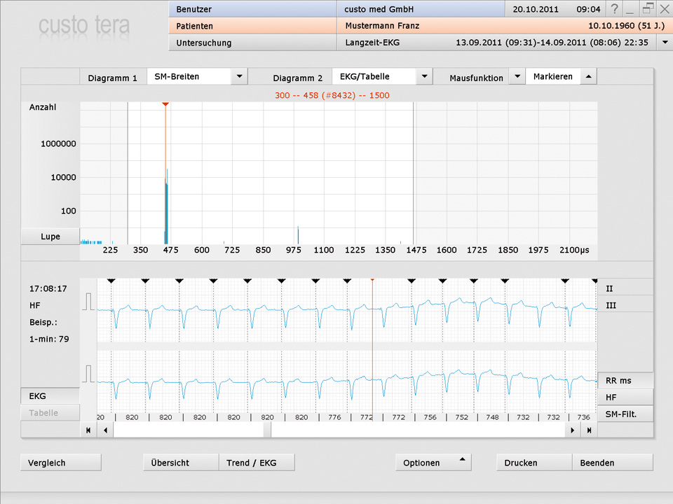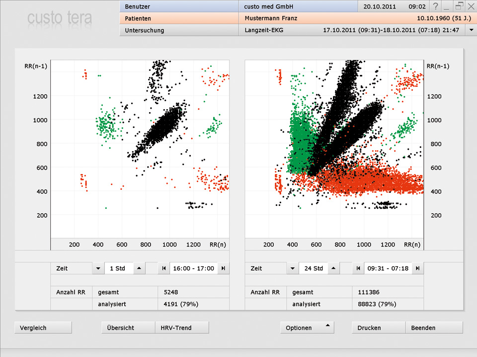 Hem süre spektrumunda hem de frekans spektrumunda kalp hızı değişkenliğinin incelenmesi ritm holter custo tera yazılımının yüksek çözünürlüklü ECG analizi sayesinde tam takip edilebilir. Tüm standart trendler (örn. SDNNS, ANN5, RMSSD, pNN50) görüntülenir. İlginç pozisyonlara uyan EKG hemen görüntülenir. İki boyutlu bir "scatter plot" ardışık RR aralıklarının zaman davranışını gösterir.