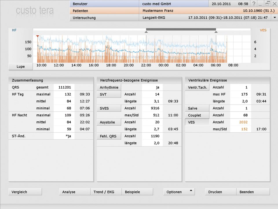 Kaydediciden indirilmiş EKG verilerin analizinden hemen sonra 24 saat kayıtın özeti mümkündür. Tüm patolojik vurular, patolojik vuruların değerleri özellikle zaman ve süre noktasına göre belirtilir.Kalp hızı trendi grafiği aynı anda isteğe bağlı seçilebilir patoloji ile görüntülenir. Bir fare tıklaması (bakınız turuncu işaret ) ile ilgili EKG örneği tüm önemli göstergelerle birlikte doğrudan tekrar çağrılabilir. Patoloji trend eğrisi eş zamanlı gösterimi ile aynı tipin devamı olaylara çabucak erişilmesini sağlar.Seçilmiş sonuçların çabuk doğrulamasını sağlayan geniş editör fonksiyonlu kullanıcı arayüzü ile açık bir yapıdır.Ayrıca QT analiz ve Atrial Fibrilasyon algılama mümkündür.