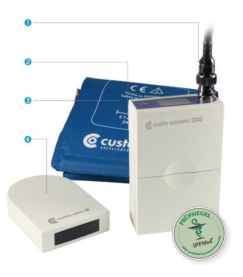 custo screen 300, Dünya çapında Avrupa Hipertansiyon Derneğinin (ESH-IP 2010 protokolü) bağlayıcı gereksinimlerine göre onaylanmış ilk ABPM (Holter Tansiyon kayıt cihazı) kaydedici cihazdır.Ölçüm doğruluğu ve güvenilirliği custo screen 300’ün temel özelliğidir. Bu sistem için geliştirilen ölçme teknolojisi karşılaştırılabilir sistemlere göre önemli ölçüde daha yüksek parazit giderilmesini sağlar. Otomatik gündüz ve gece tanıma, kısa şişirme ve tahliye süreleri ve düşük gürültü çalışması ile kaydedici yüksek hasta konforu sağlar. Kolay temizlenebilir manşetlerin S – XXL arası tüm boyutları mevcuttur.