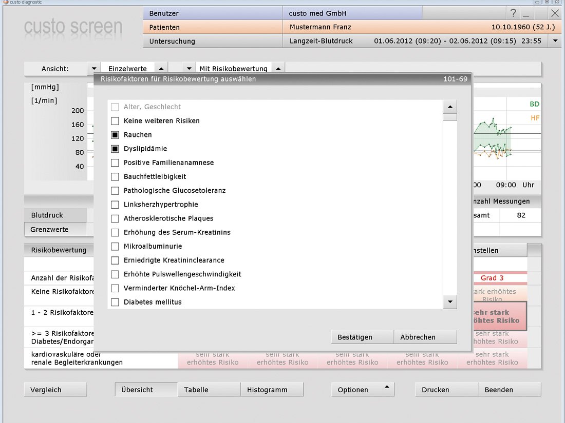 Risk faktörleri sadece onay kutuları tıklatarak seçilir. Onlar otomatik olarak kaydedilir ve başka bir kayıt yapıldığı zaman değerlendirmeye entegre edilir. Herhangi bir zamanda risk faktörleri seçimini adaptasyon için değiştirebilirsiniz.
