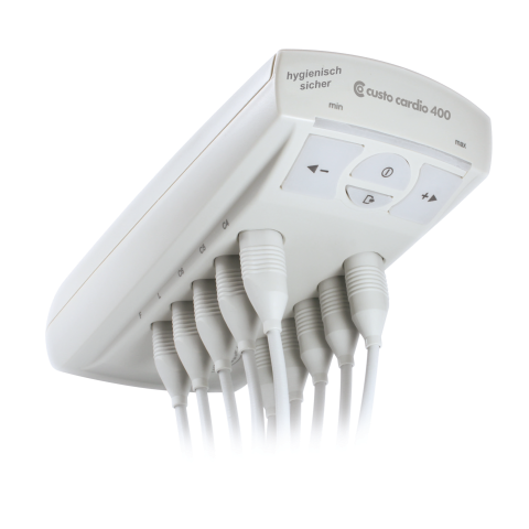 custo cardio 400, vakum üniteli olup Normal / Stres testi için 12 kanal EKG cihazıdır. İşlevsellik, işlerlik ve hijyen konularında yeni standartlar koyuyor. Yoğun test serilerinden sonra, custo cardio 400 - öncül custo cardio 200 gibi - Alman Hastane Hijyeni Derneği sertifikasını aldı. Değiştirilebilir, yeniden kullanılabilir elektrotlar, hijyenik yönler söz konusu olduğunda kusursuz bir uygulama sağlar. Geliştirilmiş kalp pili algılaması, yeni custo true wave® filtreleri, 32 kHz'e varan bir örnekleme hızı ve yüksek fonksiyonelliğe sahip olan custo cardio 400, en yeni neslin 12 kanallı EKG'si olmuştur.