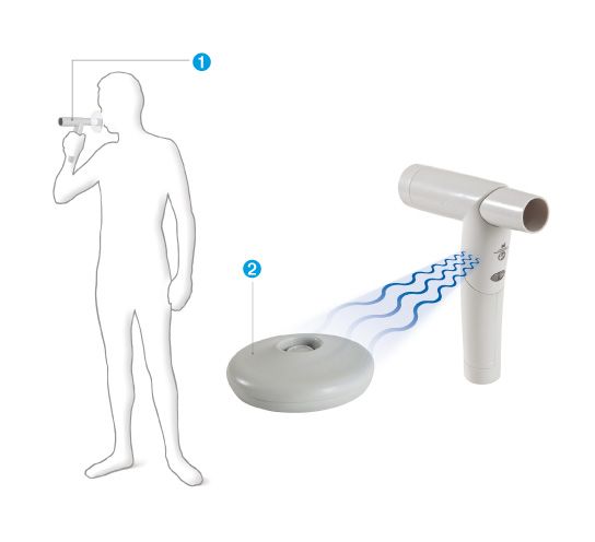 Yeni kablosuz solunum fonksiyon cihazı, ölçüm boyunca doğru duruşun kontrolü ve otomatik dökümantasyonu için entegre edilmiş eğim sensörü ile birlikte gelir. Entegre ortam ölçüm sistemi otomatik olarak çevresel koşullarını yazılıma iletir.