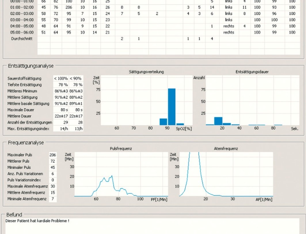 Tüm analiz sonuçları tabloda özetlenmiştir. Düzenlenebilir alanlar apne analizi, doygunluk analizi, frekans analizi ve olaylar listesi için hazırlanmıştır. Buna ek olarak, değerlendirme başka bir alana girilebilir.