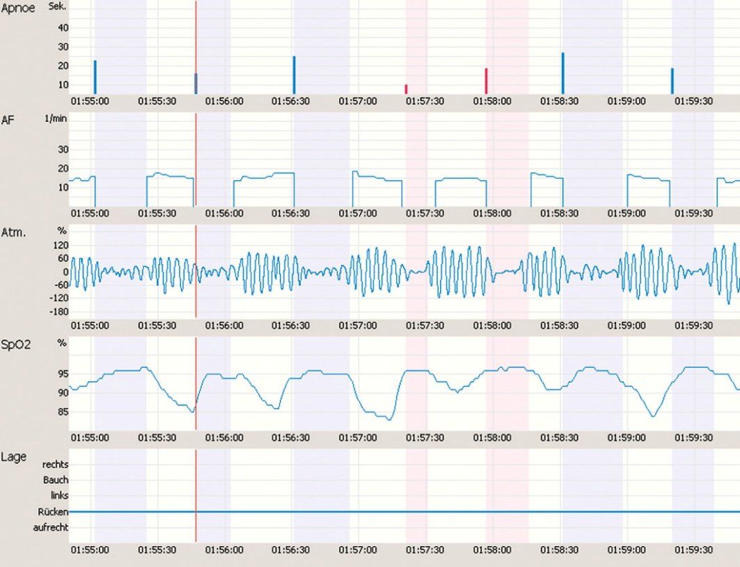 Apne ve hipopne fazlarının otomatik algılamasını doğrulamak için, doktor bir fare tıklaması ile düzenleme moduna geçiş yapabilir. Örnekteki gibi, grafik 5 dakikalık bölümü apnea ve hipopne fazlarının bir dizisi ile göstermektedir. Doktor hızla bir fazdan bir sonraki faza geçebilir. Trendler ve sinyallerin düzenleri serbestçe yapıla- dırılabilir.